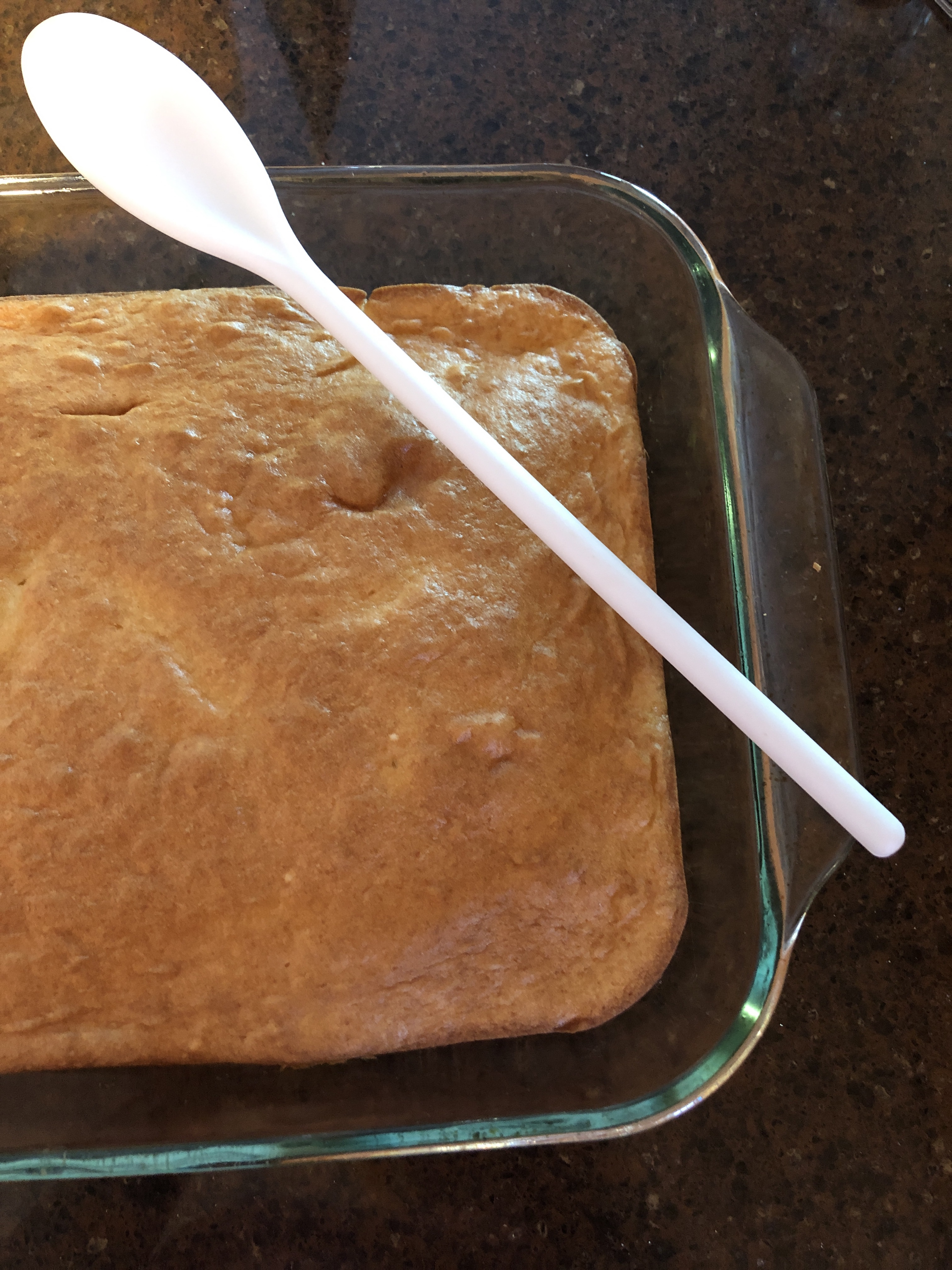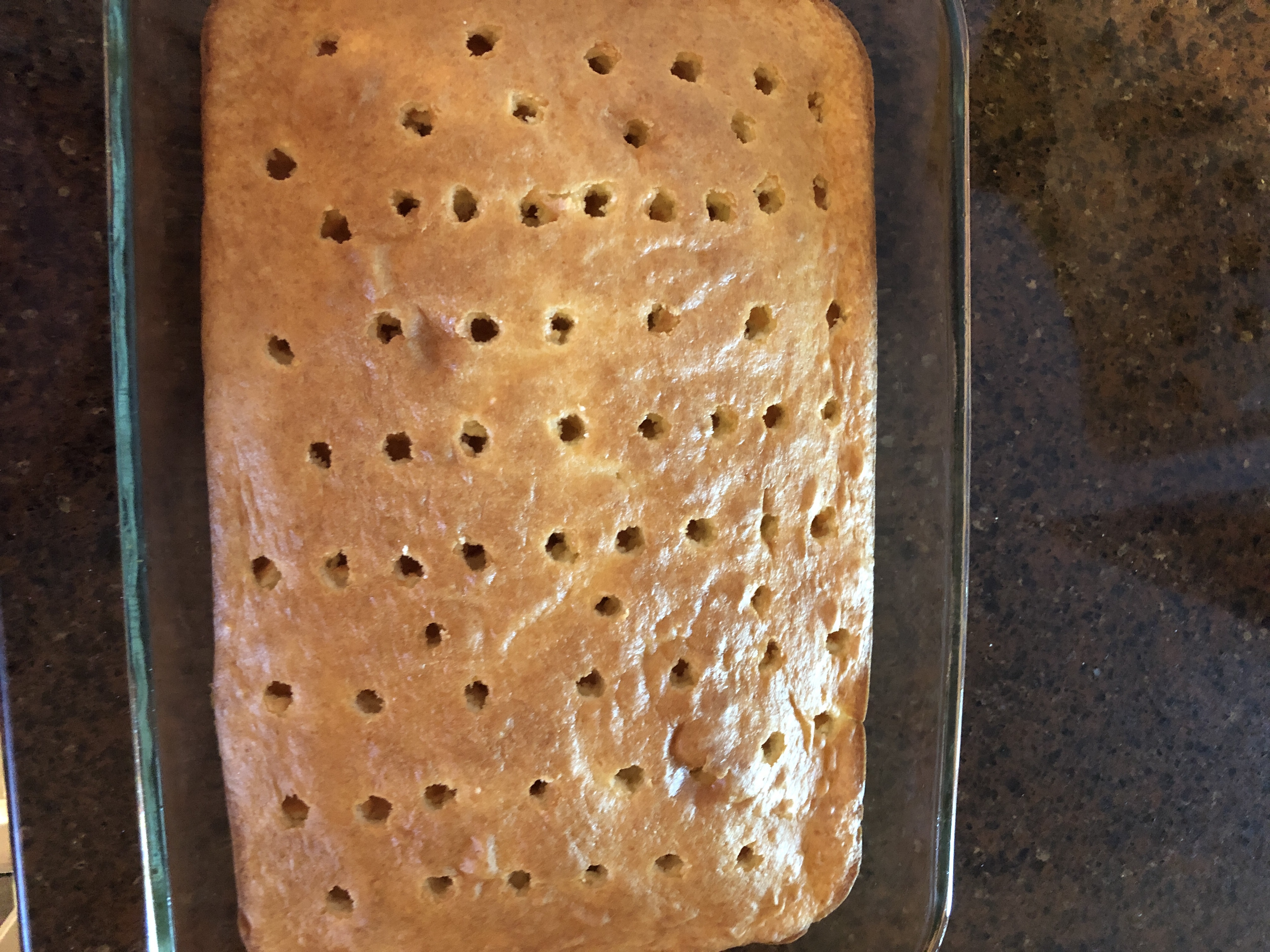 When your cake has cooled, poke holes in it. You can use a fork or a skewer. My preferred poking tool is a round handled mixing spoon that I have kept on hand exclusively for poking cakes. You want the holes pretty evenly spaced across the cake but perfection isn’t necessary.